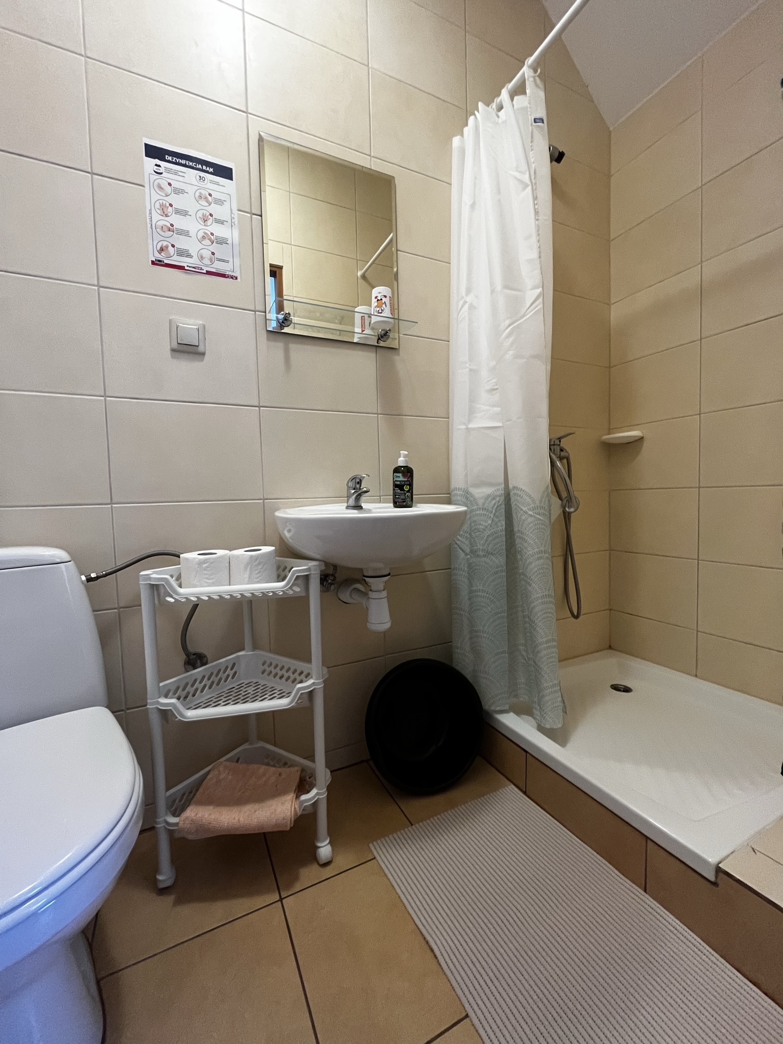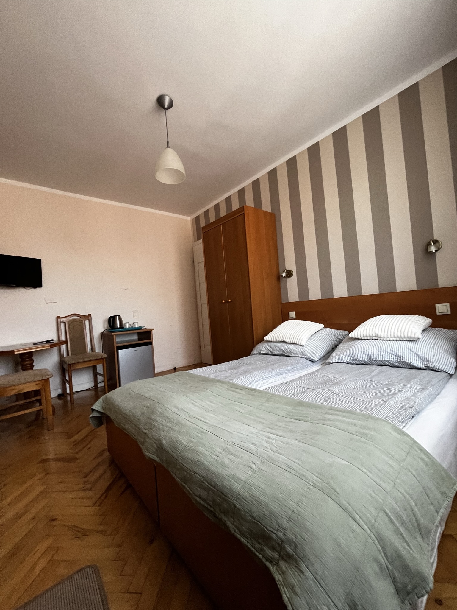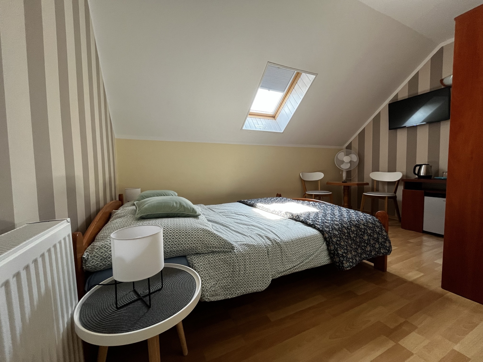 Pokój znajduje się na drugim piętrze, aneks kuchenny znajduje się piętro niżej. Łazienka w pokoju.